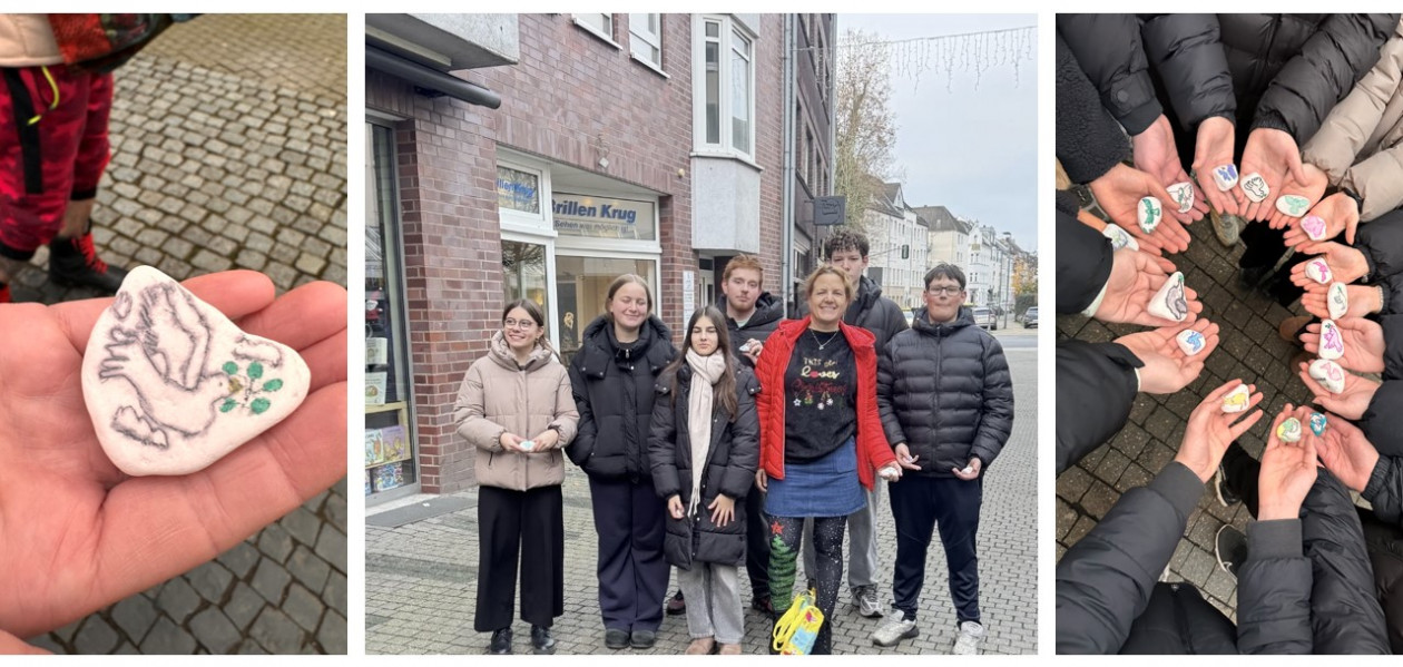 Im Religionskurs der Klasse 9 entstand – ausgehend vom Mutstein-Konzept von Stark auch ohne Muckis – eine besondere Idee: Die Schülerinnen und Schüler wollten die Mutsteine kreativ weiterentwickeln und daraus eigene Friedensmutsteine gestalten. Mit Friedenstauben, Hoffnungsworten und persönlichen Symbolen bemalt, sollten sie nicht nur ausgelegt, sondern ganz bewusst an fremde Menschen verschenkt werden.