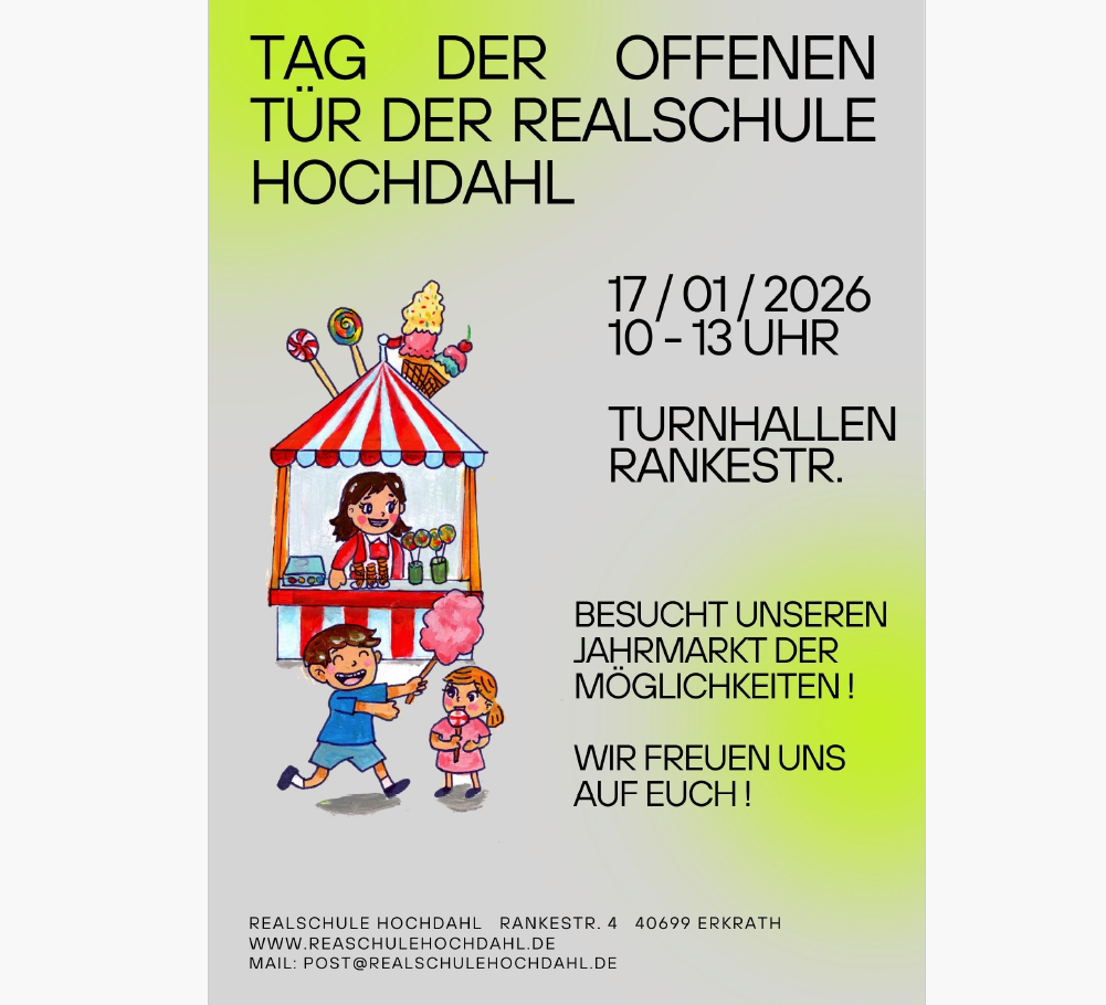 Am Samstag, den 17. Januar 2026, öffnen wir von 10:00 bis 13:00 Uhr die Türen unserer Realschule Hochdahl in der Sporthalle, Rankestraße 4–6 in Hochdahl.